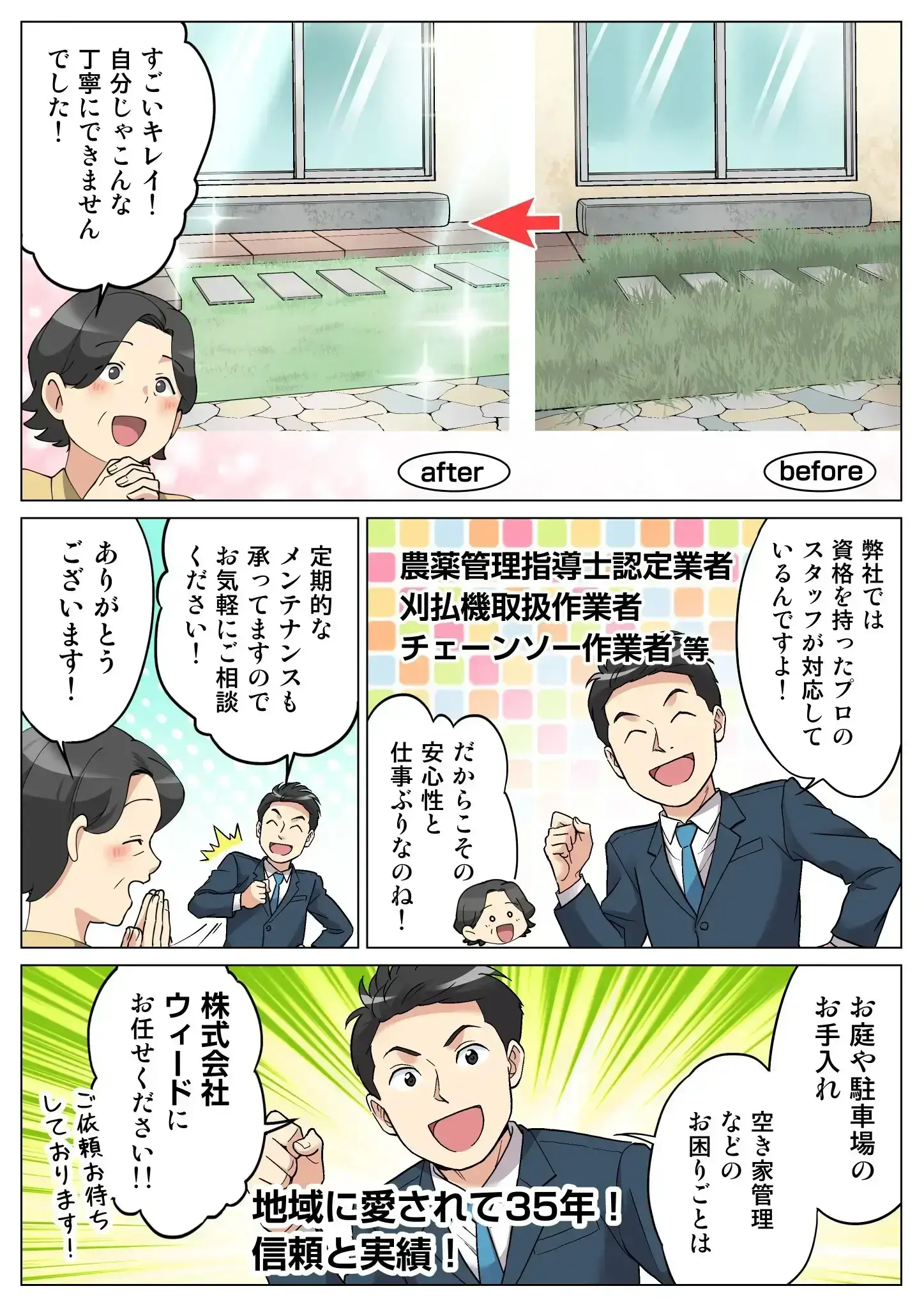 ウィードは創業35年の実績があり、多くのお客様から信頼とご好評をいただいております。お客様のニーズに応じた丁寧な作業をいたします。また、資格保有者も多数在籍しておりますので、安心してご依頼いただけます。